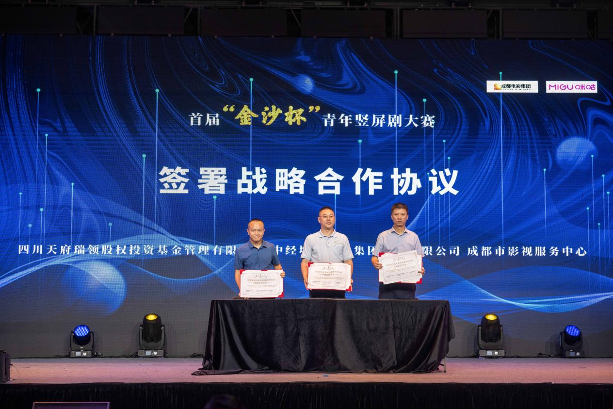 中國移動(dòng)咪咕公司咕咕工作室短劇制片人黃振民 (左)、四川電影電視學(xué)院黨委副書記、副校長羅思(中)、成都市影視服務(wù)中心人才孵化基地負(fù)責(zé)人張易(右)簽署影視人才培養(yǎng)、輸送框架合作協(xié)議